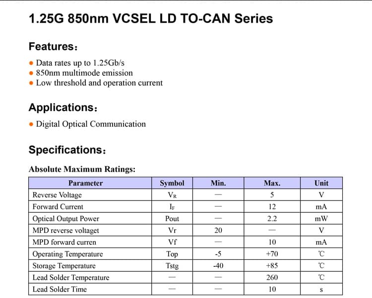 Subject : 1.25G 850nm VCSEL LD TO-CAN Series laser diode
