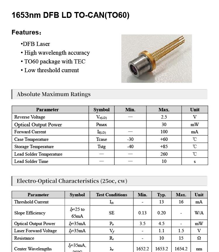 1653nm DFB LD TO-CAN(TO60) CH4 gas sensor laser diode