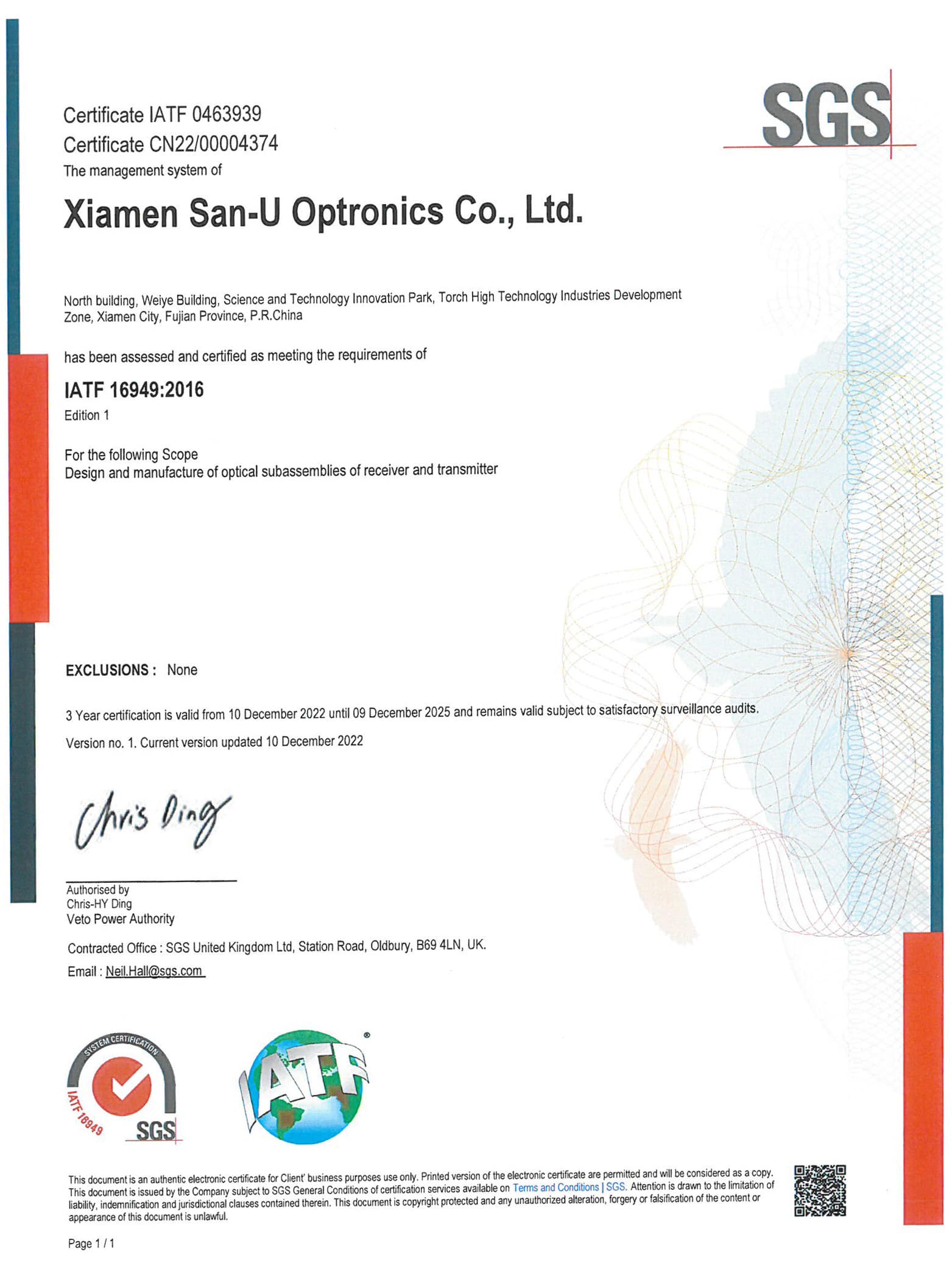 Xiamen SAN-U Optronics Co., Ltd. was established at the beginning of 2001,has been a high-tech enterprise specialize in professional R&D and production of high-speed semiconductor lasers / detectors, optical components and optical modules.