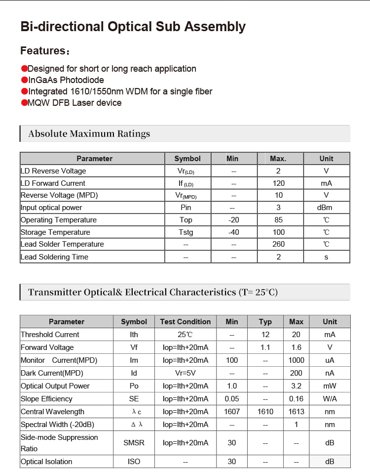 RFoG BOSA Bi-directional Optical Sub Assembly