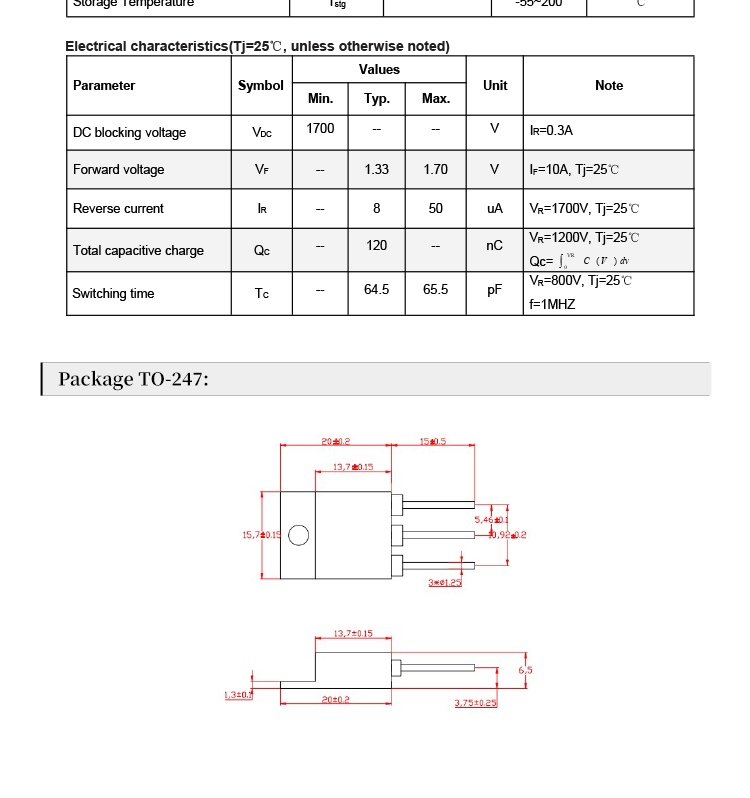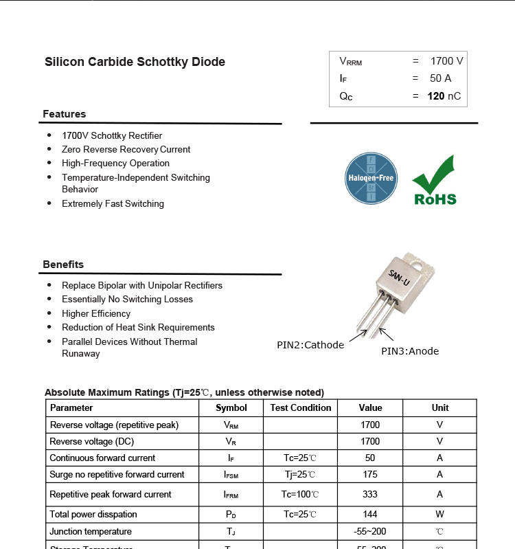 SiC Schottky diode SBD 1700V 2~100A TO247 packaged high-voltage electronic components